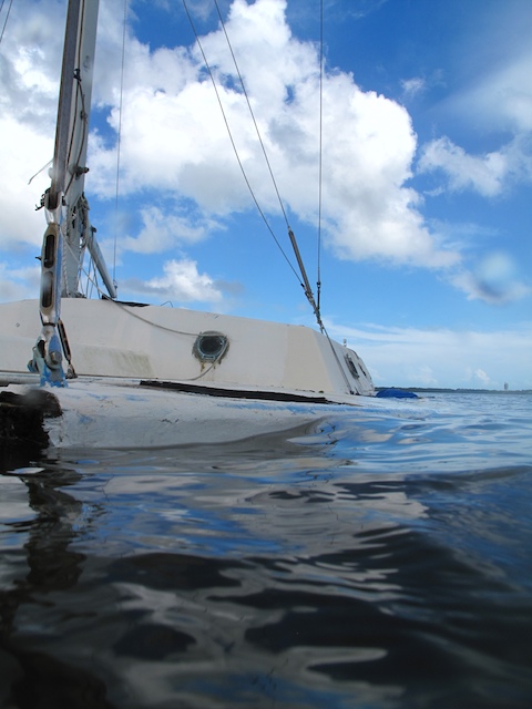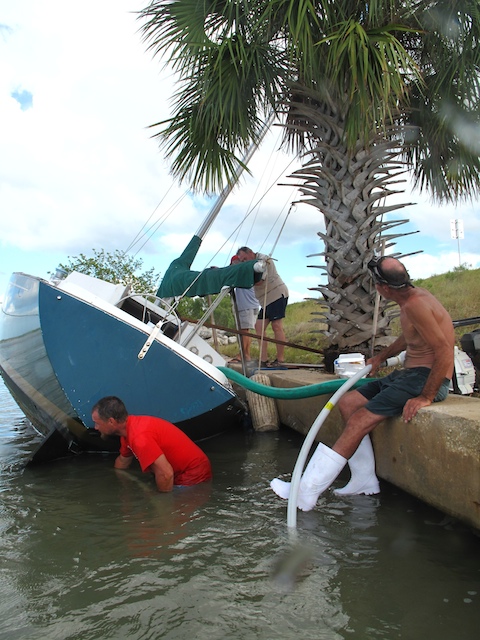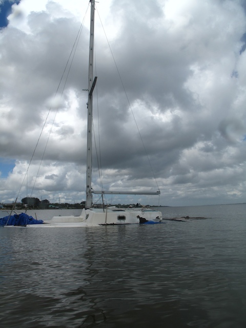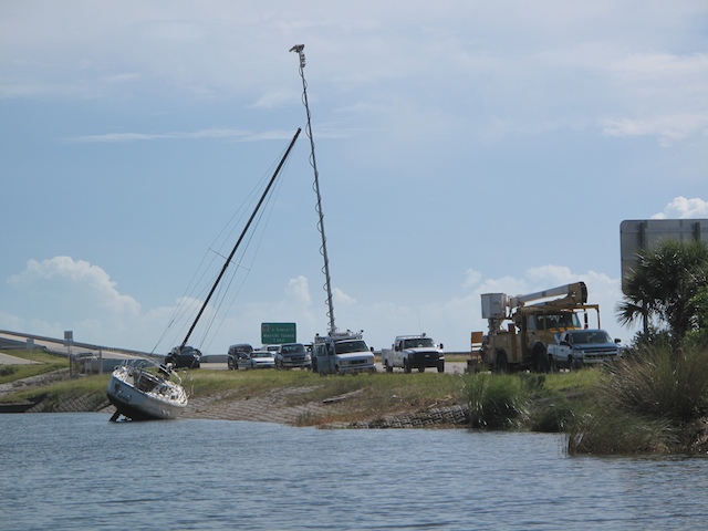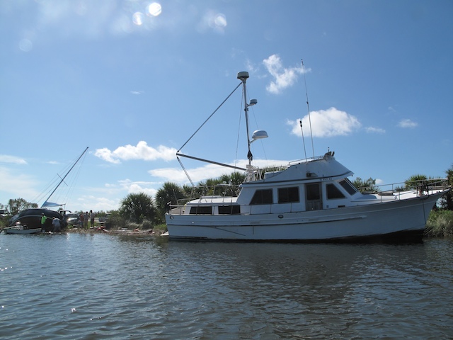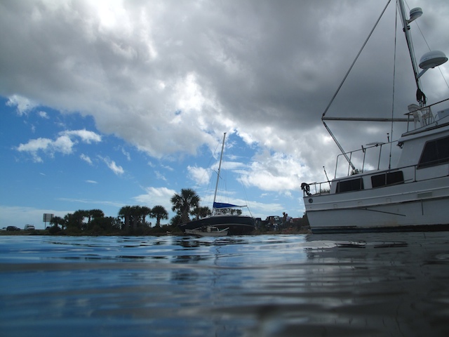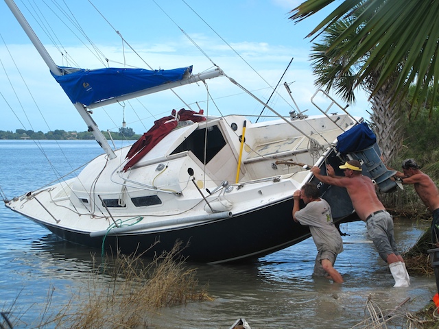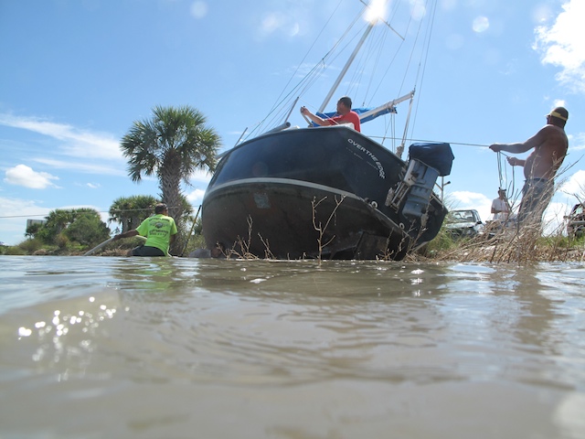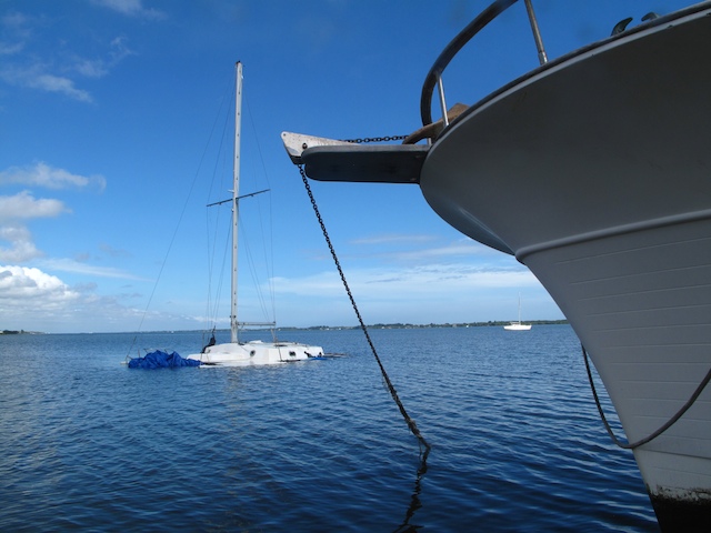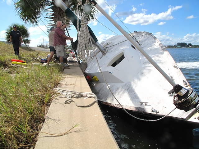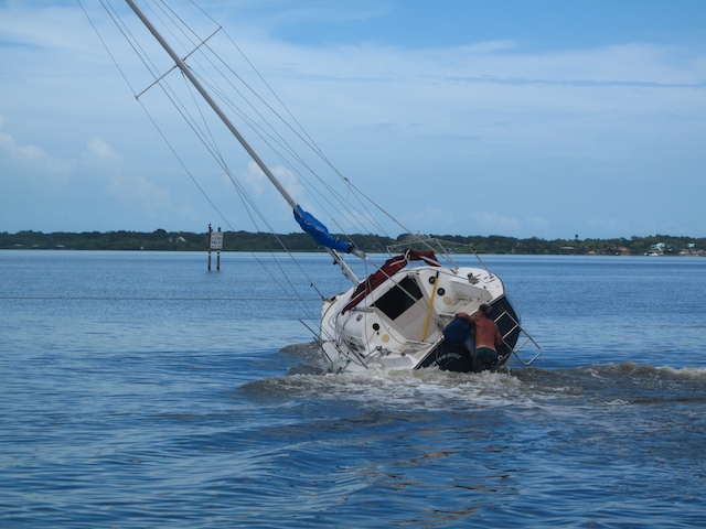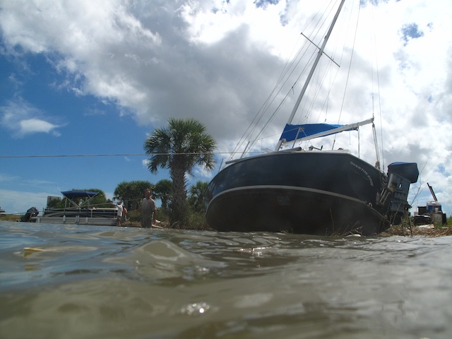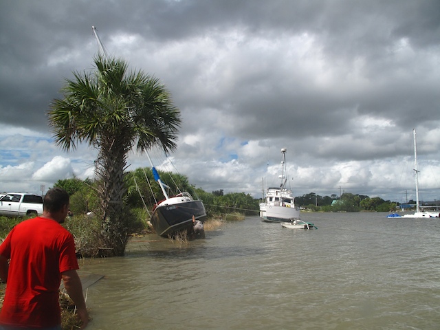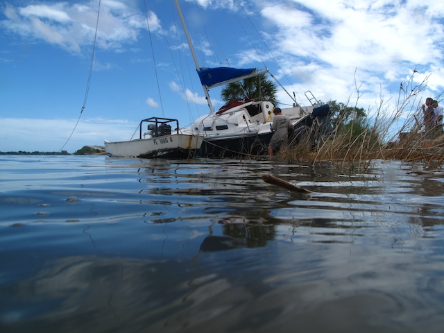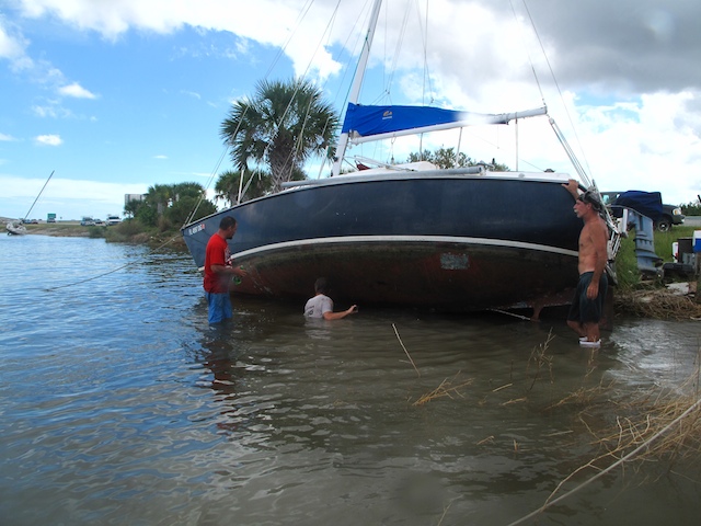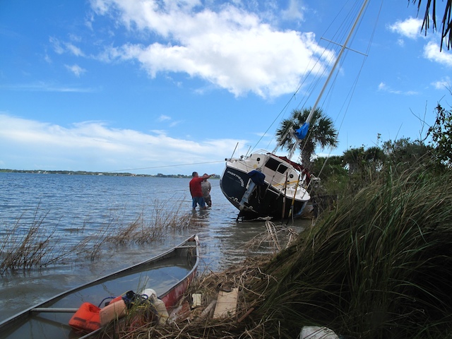 A vicious storm came through Brevard Country on October 9th. Winds came out of the east at fourty plus knots. There is a small harbor north of Pineda Causeway and US1. There are a number of small sail & motor boats moored in the area. The anchor systems failed and all the boats washed ashore from ropes fraying and breaking, and chains failing. Most are recoverable, but a few are either sunk or severely damaged. On Oct 10th I was on hand to watch and help out with the recovery of two boats.